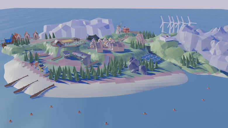 Gaming Environment Design project using Blender to 3D model an island environment, including buildings, trees, landscape elements, solar panels and wind turbines. I created animations for use in a final demonstration video, including camera movements and object movements. I used PhotoShop to create the User Interface overlays.