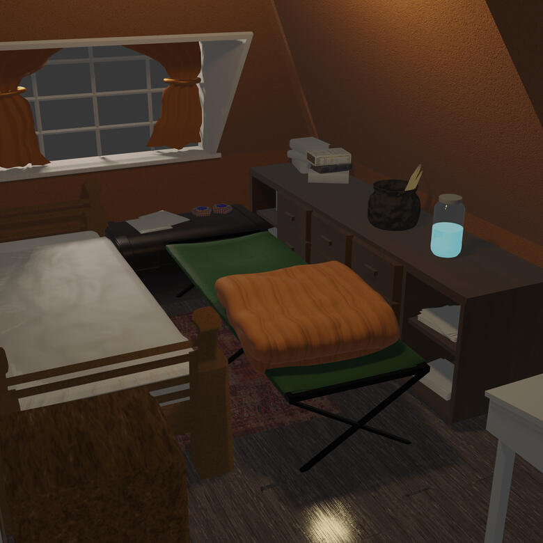 To hone my skills in Blender I have been replicating film/book environments in my own time. My current project is a magical Bedroom, where I have built all assets including beds, bedding, furniture and smaller props.