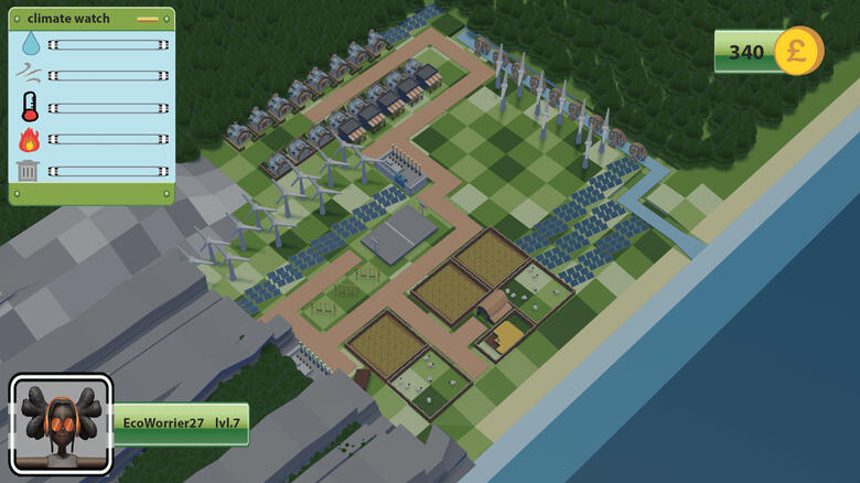 Gaming Environment Design project using Blender to 3D model an island environment, including buildings, trees, landscape elements, solar panels and wind turbines. I created animations for use in a final demonstration video, including camera movements and object movements. I used PhotoShop to create the User Interface overlays.